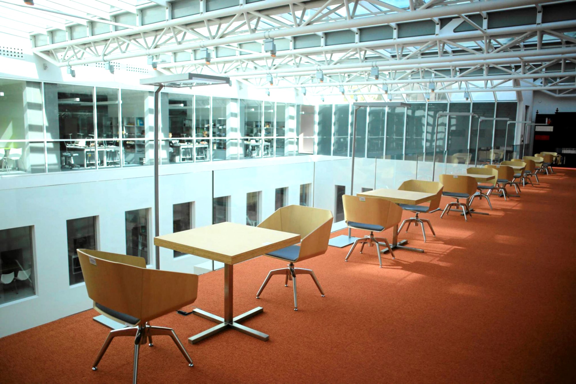 W przestrzeni foyer zawieszone zostały również galerie, które stanowią komunikację dla funkcji na piętrach, ale również stają się częścią „życia” dziedzińca. Udostępniony został również stropodach, niższej bryły historycznego budynku, zaraz pod nowym szklanym przekryciem. To miejsce zaaranżowane zostało, jako miejsce relaksu i spotkań.
