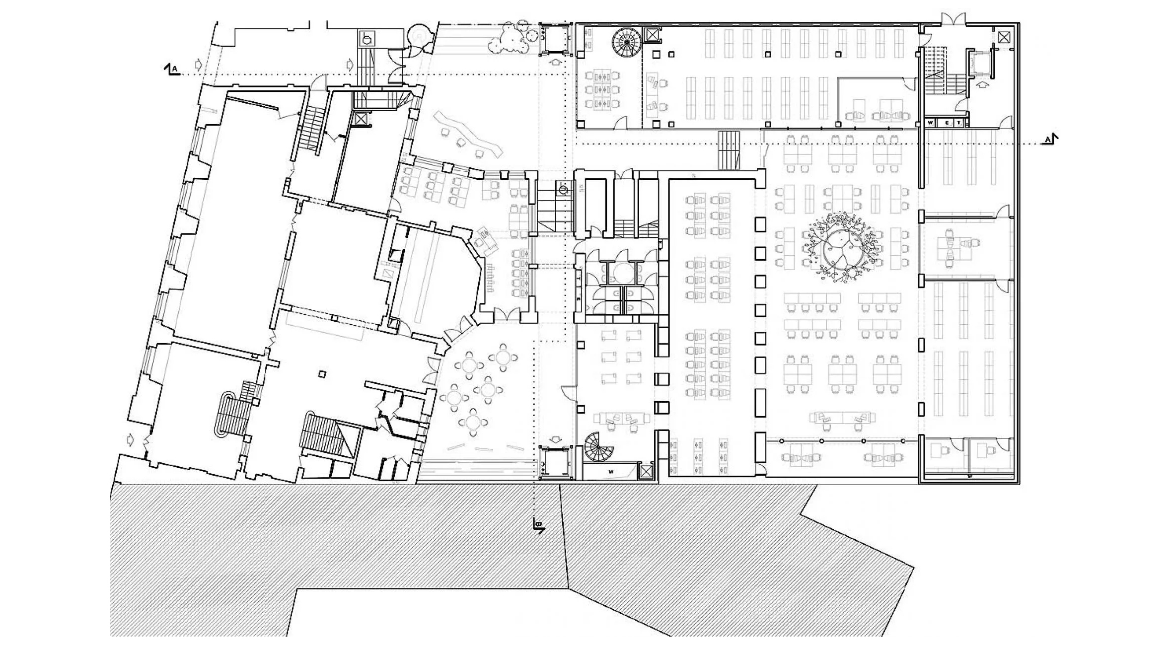 Architekci zdecydowali się, aby cały budynek z 1914 roku wraz z nową rozbudową został przeznaczony bibliotece, a funkcje niedostępne publiczne, administracyjne itp. zostały przeniesione do plomby z lat 70. Podstawą działania obok łatwej dostępności czytelni dla użytkowników było również uwzględnienie tzw. drogi książki, która usprawnia pracę bibliotekarzy.